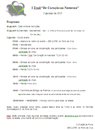 Aqui serão divulgadas todas as datas e horas de eventos relacionados com a prova... desde data de início de inscrições, entrega de dorsais e finalmente lista de atividades e horários das provas.